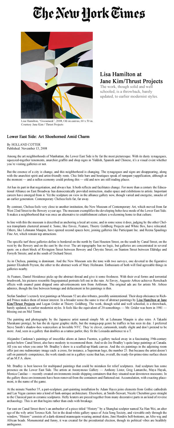 Holland Cotter , "Lower East Side: Art Shoehorned Amid Charm", The New York Times , November 13, 2008, C29.